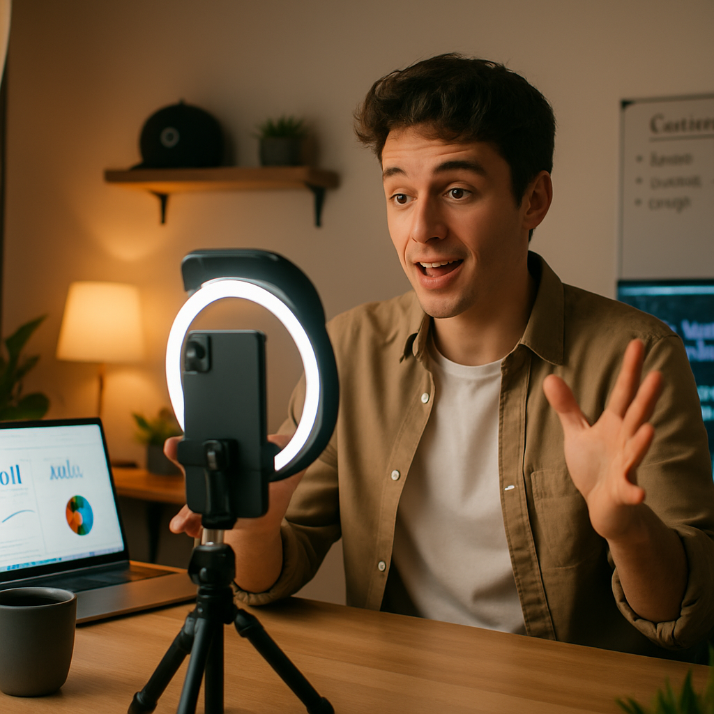 1. Telefon sa dobrom kamerom; 2. Dodatno osvetljenje (ring light ili softbox); 3. Stabilizator ili stativ; 4. Mikrofon za jasniji zvuk; 5. Softver za montažu (mobilne aplikacije kao što su CapCut, VN ili Adobe Premiere Rush).
