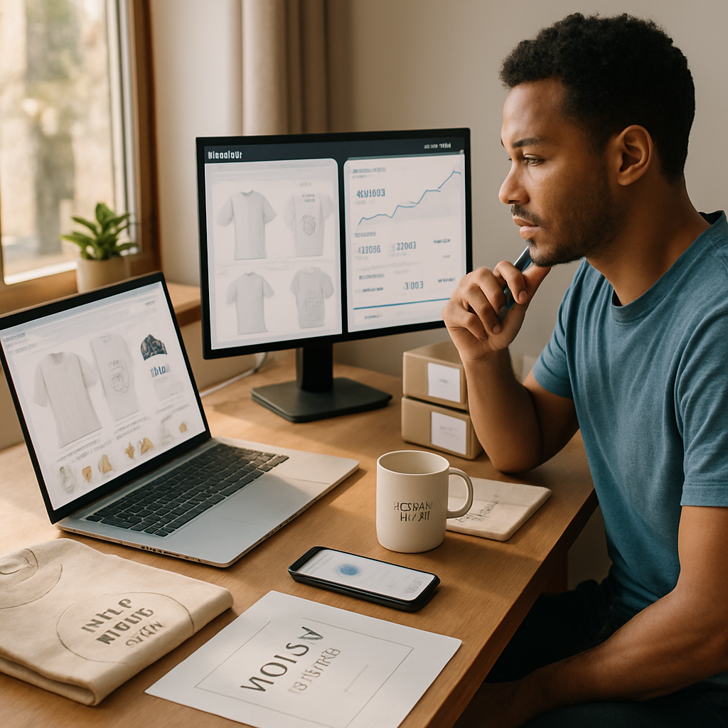 Print on demand je poslovni model koji omogućava kreiranje i prodaju fizičkih proizvoda (kao što su majice, duksevi, plakate, šolje, torbe i sl.) bez potrebe za unapred proizvedenim zalihama. Dizajner ili preduzetnik postavlja grafiku na platformu koja radi sa dobavljačem; kada kupac naruči proizvod, dobavljač štampa i šalje proizvod direktno kupcu. Glavna prednost je nizak početni trošak i minimalan rizik od zaliha.